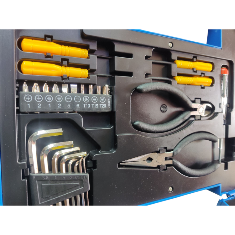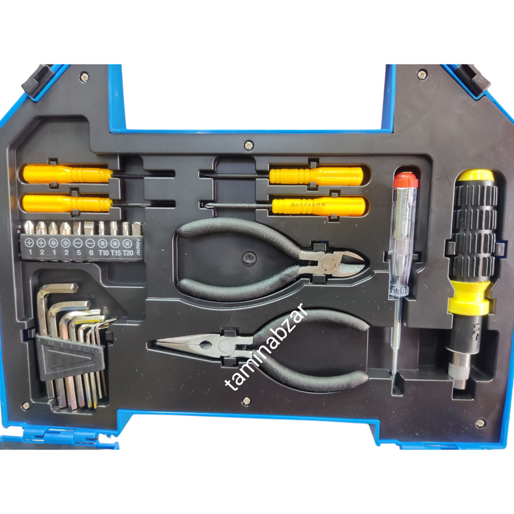 چکش ،تراز ،کاتر،آچار فرانسه ،ست آلن 8 پارچ ،متر 3/5،سیم چین حرفه ای مینی فنر دار ،دم باریک حرفه ای فنر دار مینی ،فاز متر، دسته بیت حرفه ای پیچ بند ، سری پیچ گوشتی 10 پارچ همراه با رابط،پیچ گوشتی ساعتی بیت دو پخ و چهار پیچ