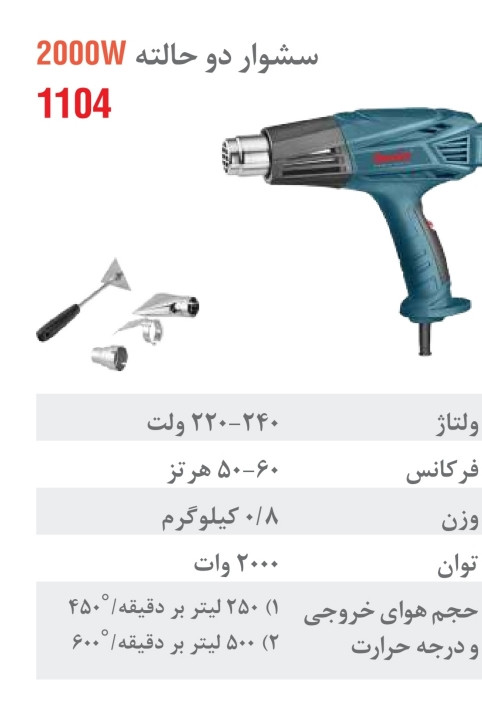 -سشوار صنعتی قدرتمند با توان 2000 وات که تنها در چند ثانیه به دمای 600 درجه سانتیگراد میرسد