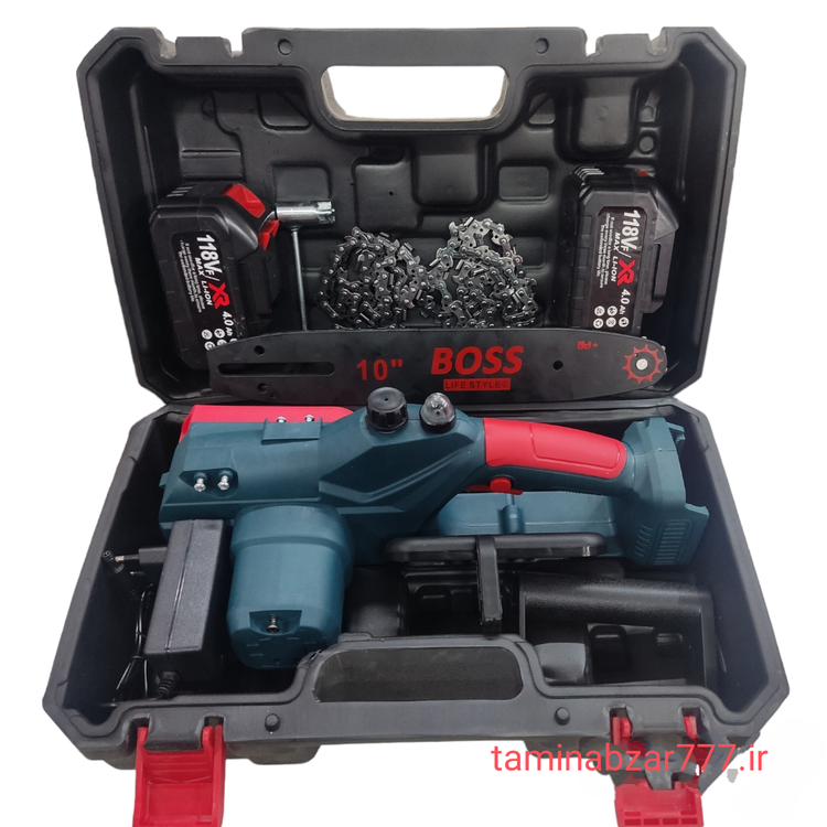 اقلام همراه: ۲ عدد باتری ۱۱۸ ولتی، شارژر باتری، یک عدد ساطوری 10 اینچ، دو عدد زنجیر، دسته نگهدارنده، یک عدد پیچ گوشتی، یک آچار مخصوص، کیف