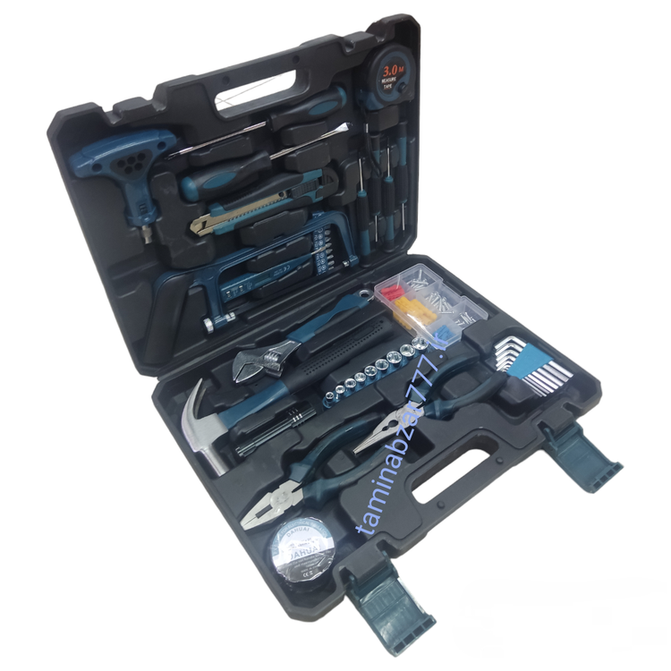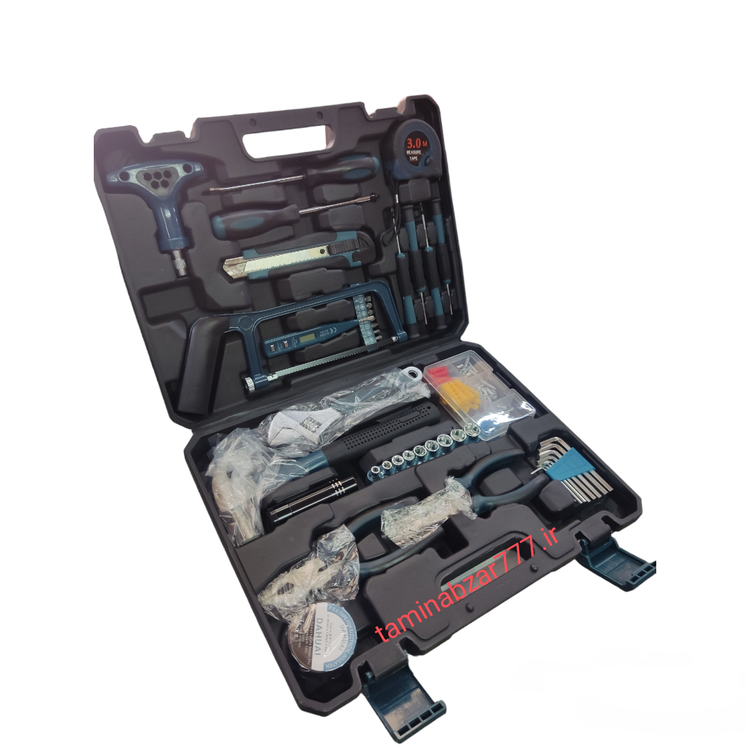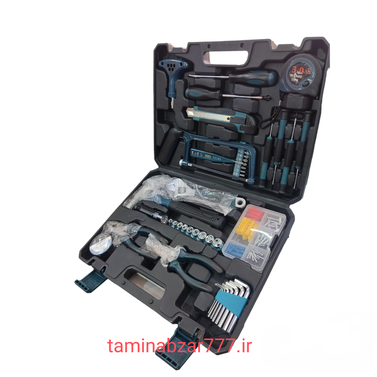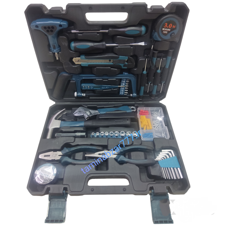 متر ،دو عدد پیچ گوشتی شامل چهار و دو سو ،چهار عدد پیچگوشتی ساعتی ،اره ،تعداد ۱۰ عدد سری پیچ گوشتی ،کاتر ،آچار ترکمتر ،ولت متر ،اچار فرانسه ،چکش ،چراغ قوه ،۹ عدد سری بکس ،انبردست ،دم باریک چسب ،۸ عدد آچار آلن ،انواع پیچ و ....