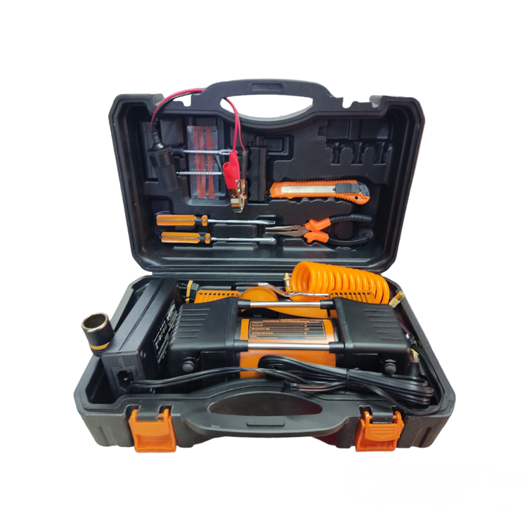 کاتر ،دو عدد درفش پنچرگیری ،دو عدد پیچ گوشتی، دم باریک ,مبدل برق ۲۲۰ به ۱۲ ولت ،کابل فندکی ،کابل مبدل ،کابل باتری ،چسب پنچر گیری ،شیلنگ هوا
