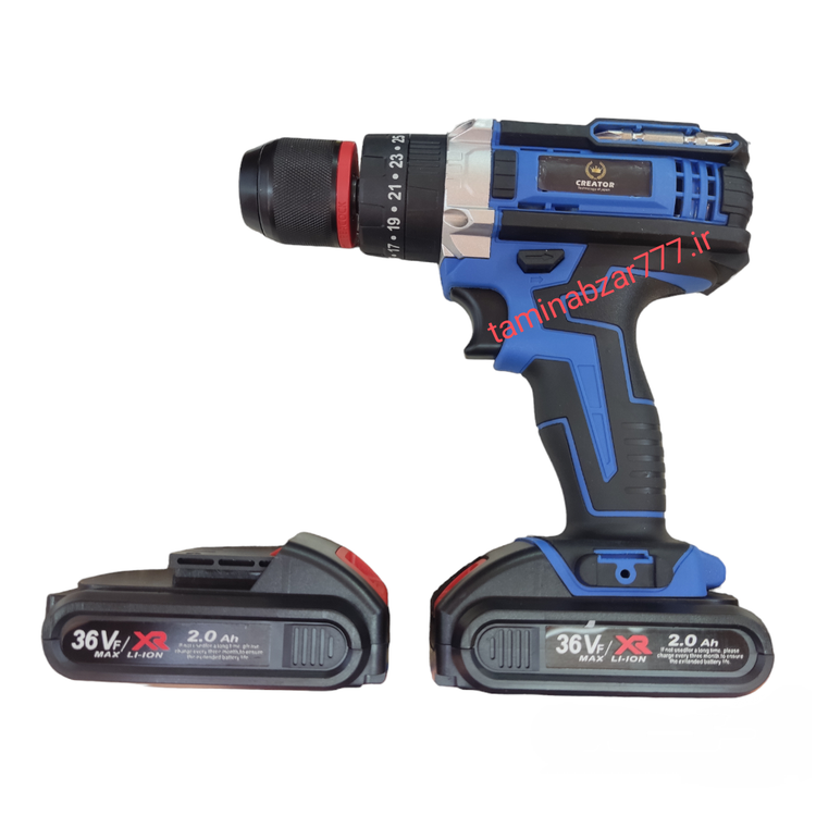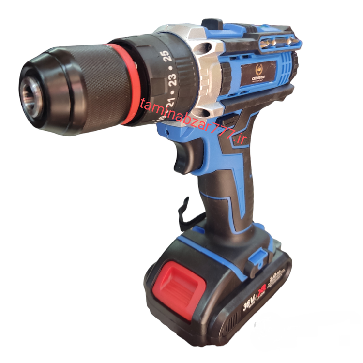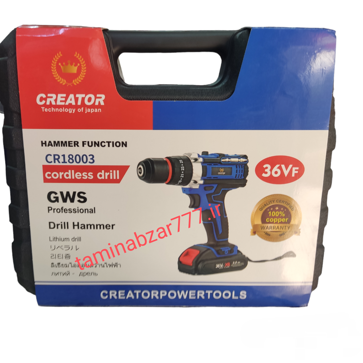 دریل شارژی کریتور 36 ولت چکشی سه نظام فلزی دو باتری تکنولژی ژاپن همراه با لوازم کامل مدل 18003